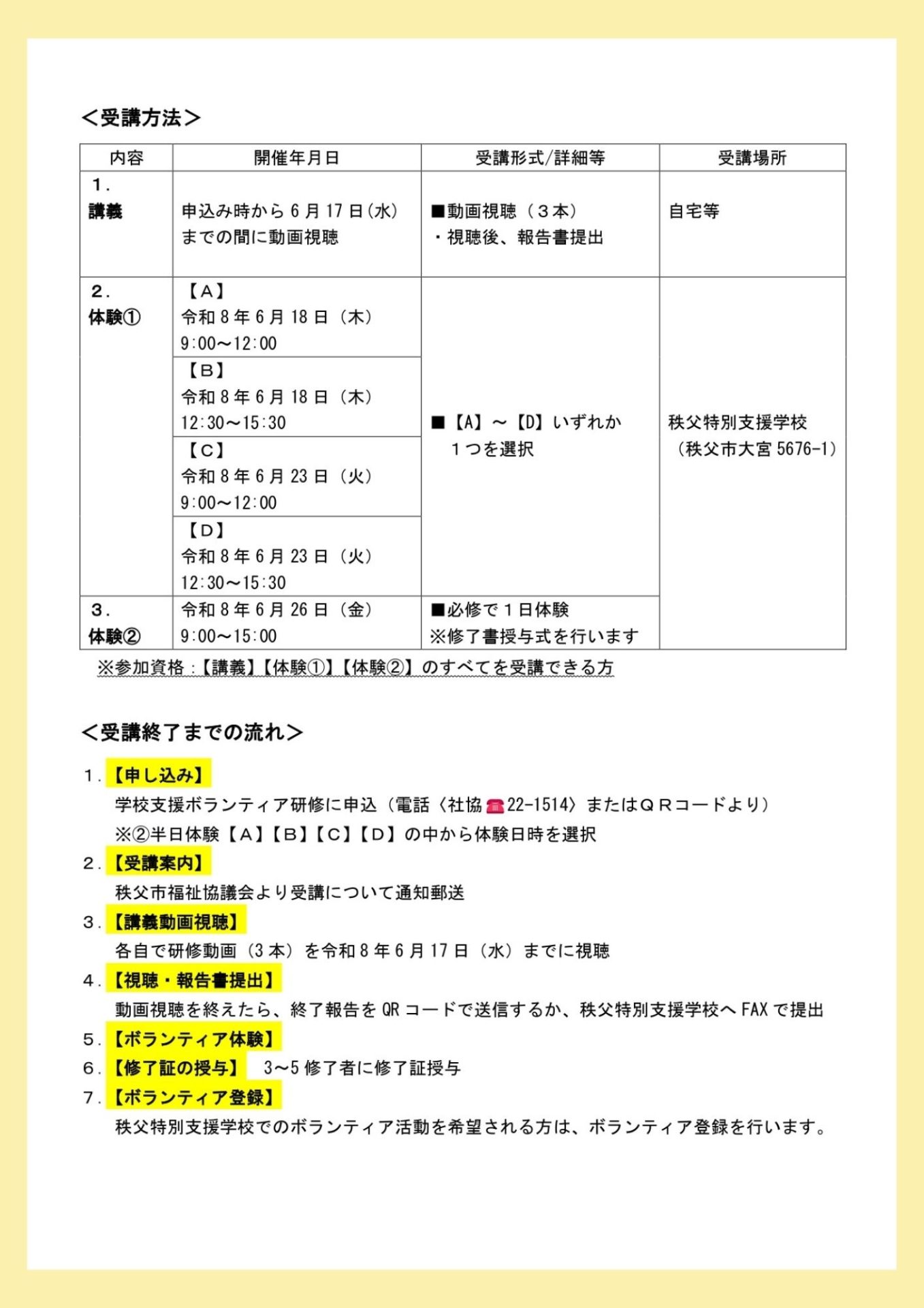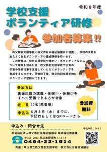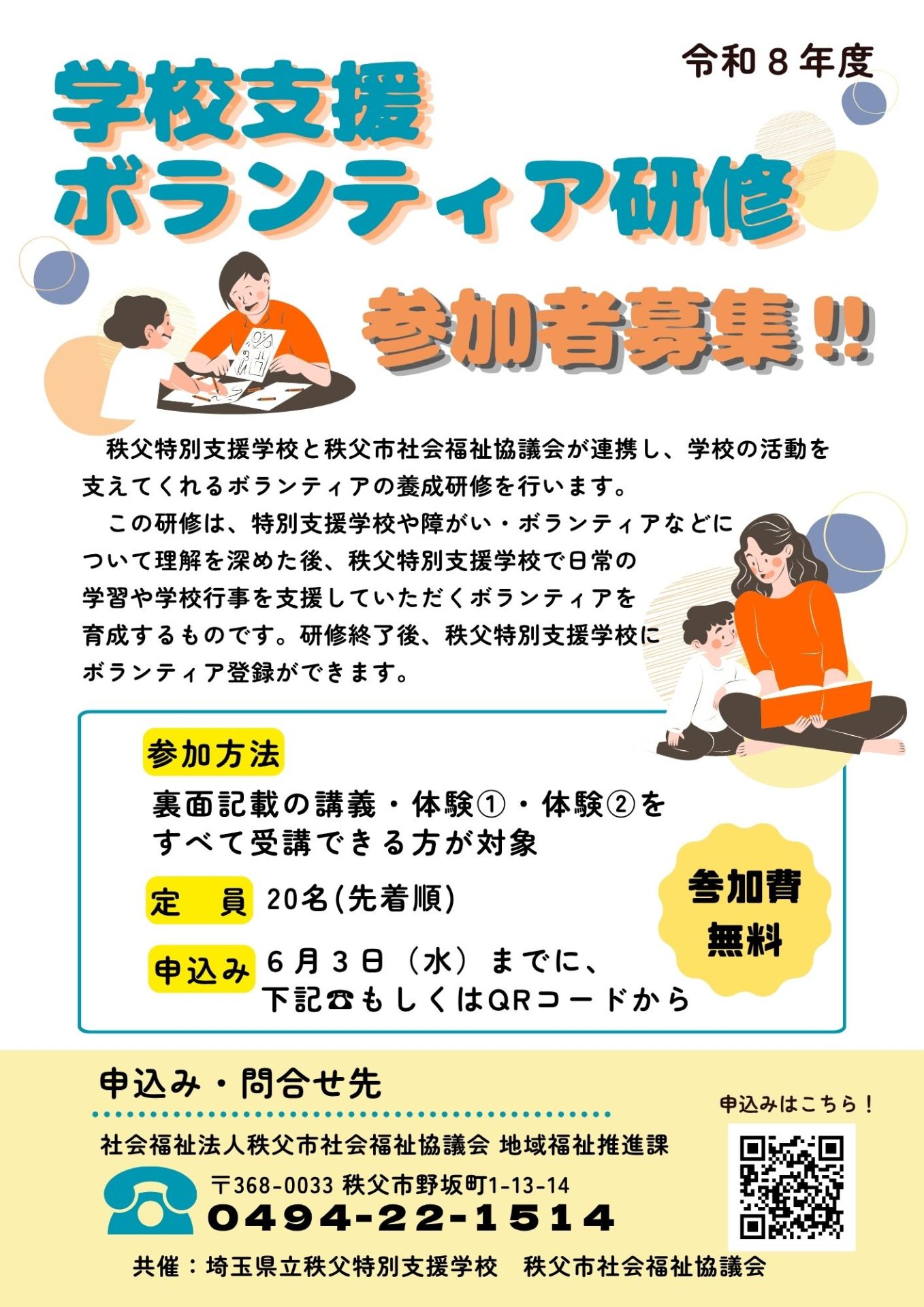 秩父特別支援学校と秩父市社会福祉協議会が連携し、学校の活動を支えていただけるボランティアの養成研修を開催します。
